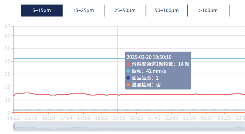 系統結合多角度數據,動態診斷油液健康度,針對 46# 無灰抗磨液壓油、68# 油等不同油品,系統實時抓取粘度、飽和度、鐵磁顆粒總數、非鐵磁顆粒總數、含水率、介電常數、污染度、壓力、振動、流量等核心參數,通過 4G 有線傳輸至本地服務器,實現數據實時集成。